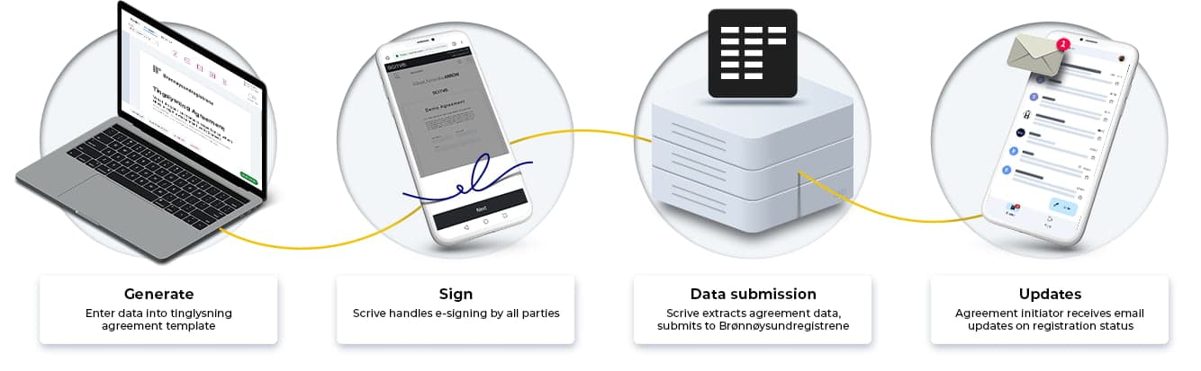 Scrive eSign collects the e-signatures from all the signing parties. Once the tinglysning agreement is signed, the Scrive integration extracts the necessary data from the document and automatically submits it to Brønnøysundregistrene for processing. The initiator of the agreement will receive status updates by email, for example to confirm that the tinglysning process has been completed successfully, or to advise if any information is missing or incorrect.