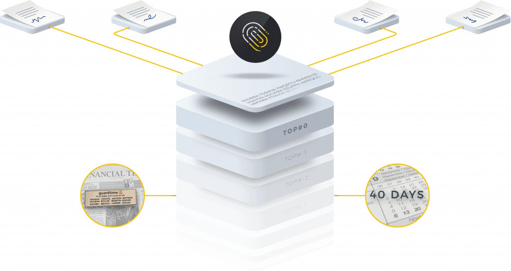 Guardtime udgiver regelmæssigt en topniveau-hash (rod-hash), der repræsenterer alle KSI -forseglede dokumenter fra en bestemt periode. Denne hash tryks i bredt anerkendte medier, såsom Financial Times , hvilket skaber et betroet offentligt tidsstempel, der ikke kan ændres med tilbagevirkende kraft af nogen part – inklusive Scrive eller Guardtime. - > Dokumentudvidelse