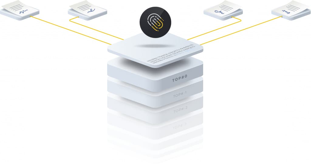 Guardtime publiserer regelmessig en toppnivå-hash (rot-hash) som representerer alle KSI- forseglede dokumenter fra en bestemt periode. Denne hashen trykkes i allment anerkjente medier, som Financial Times , og skaper et pålitelig offentlig tidsstempel som ikke kan endres med tilbakevirkende kraft av noen part – inkludert Scrive eller Guardtime. - > Dokumentutvidelse