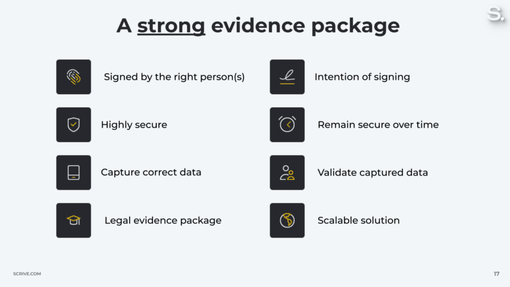 What does a “strong evidence package” mean? In short, it means you need to capture data that proves the identity of the other party, their intent to sign or agree to your terms, the process needs to be highly secure and you need to have a way to validate the data you’ve captured.