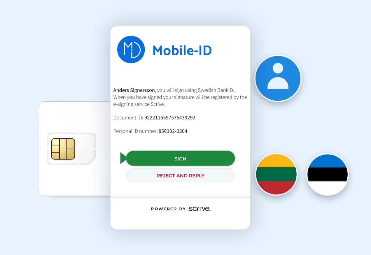 Mobile-ID is widely used across public and private sector services in the Baltic region and is available through Scrive’s eSign platform and via the eID Hub.
